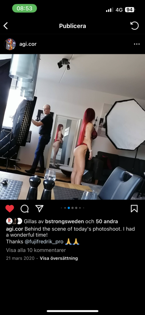 Jag har mängder med fotoutrustning att välja bland, som lyfter bilderna till nya höjder. För att nämna några så har jag flera olika färgade ljus som ger den rätta stämningen i bilderna, en beautydish för den snygga glimten i ögat, rejäla softboxar för härliga hudtoner, rökmaskin och drönare vid behov.